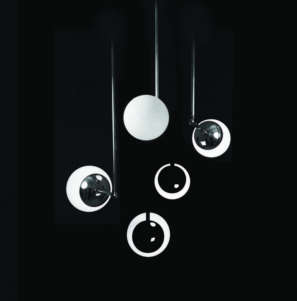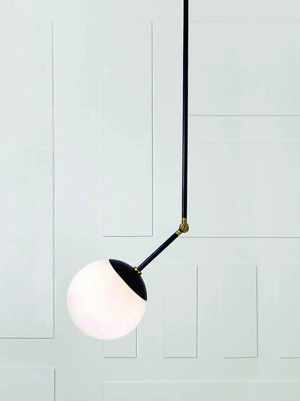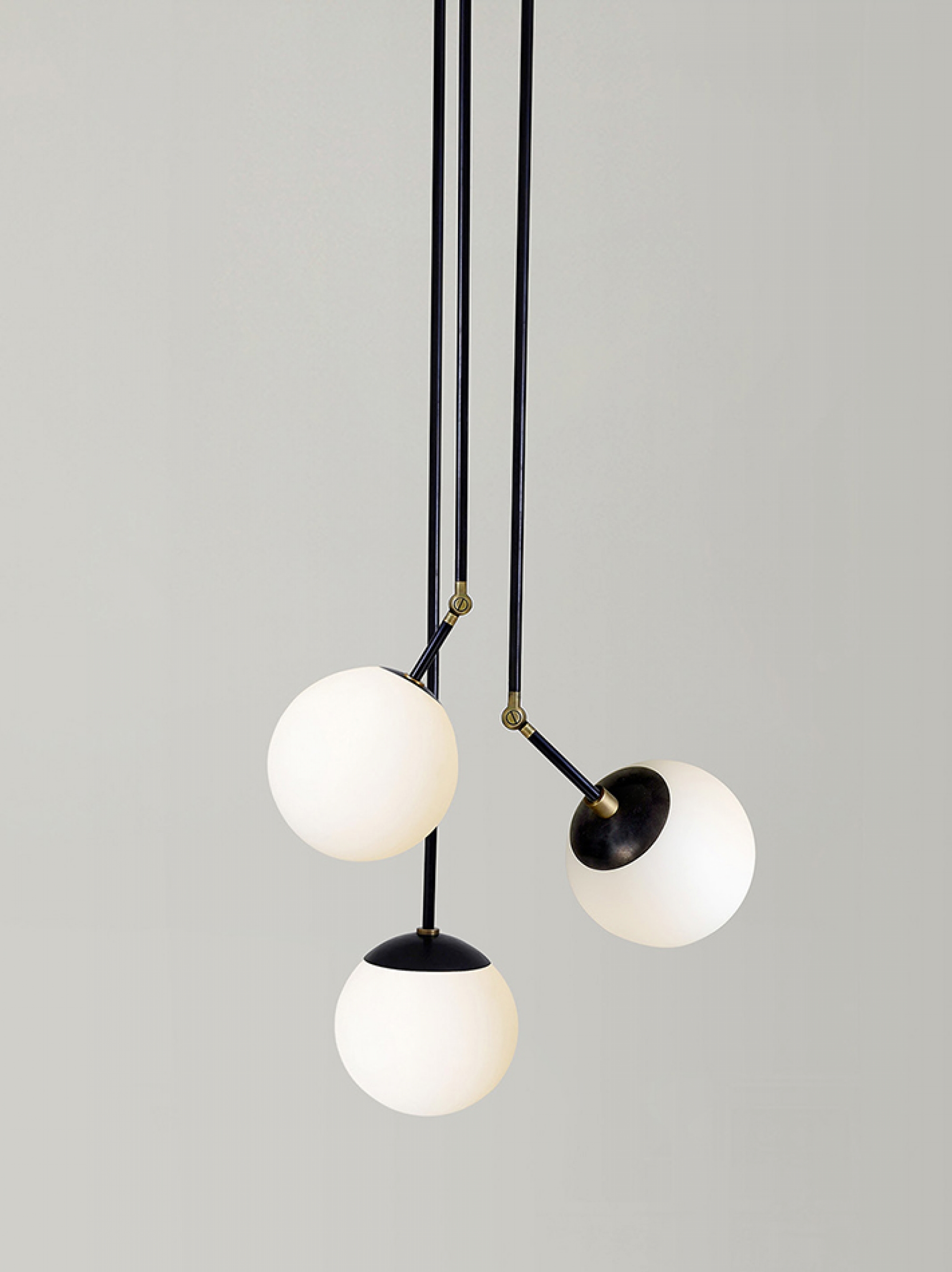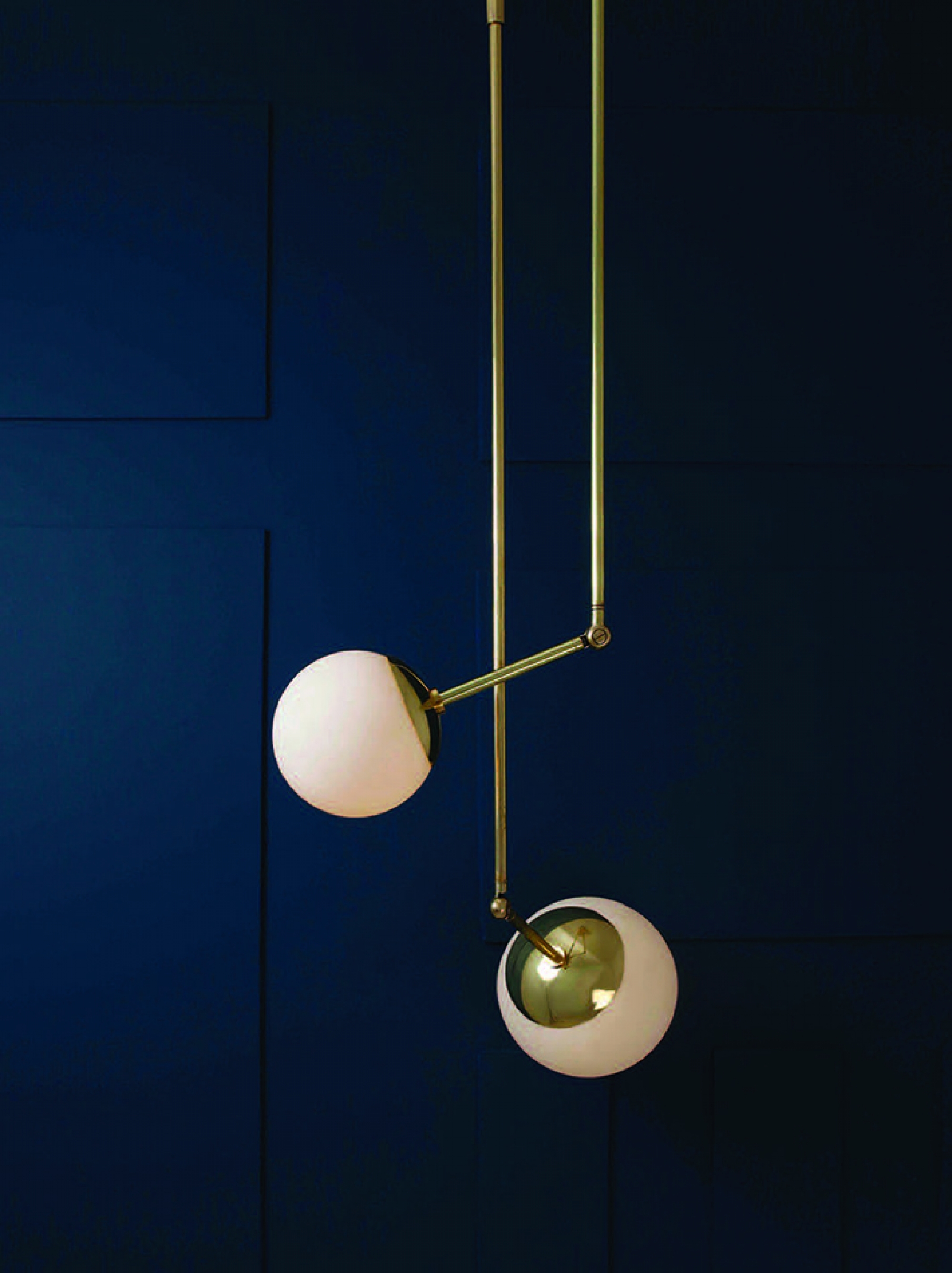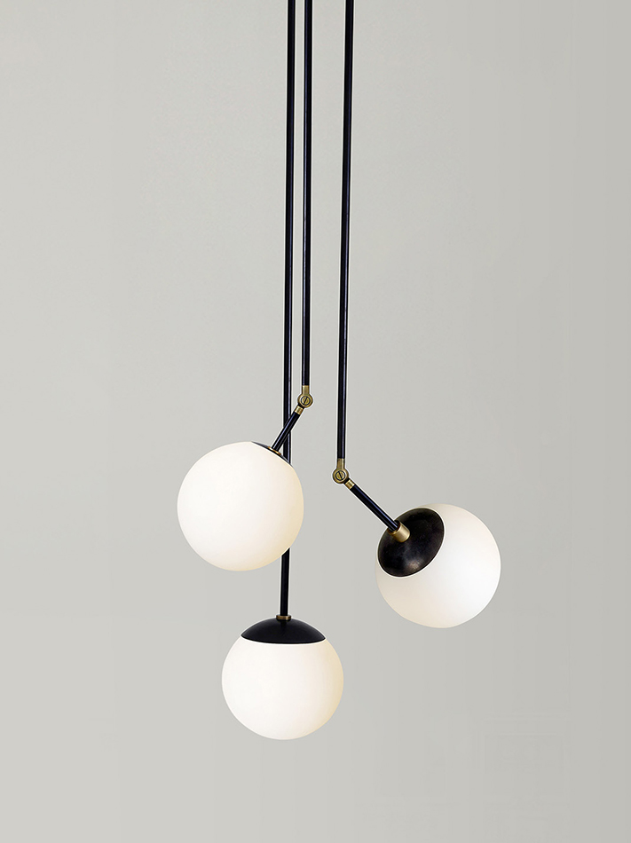 Tango is born from playful experimentation with vintage lighting components to create lighting fixtures that fuse sculptural form with hand-worn materials. Articulating elbows and brass shades create a sophisticated armature that emits soft pools of light. Tango series comprises of pendants, chande- liers and wall sconce.