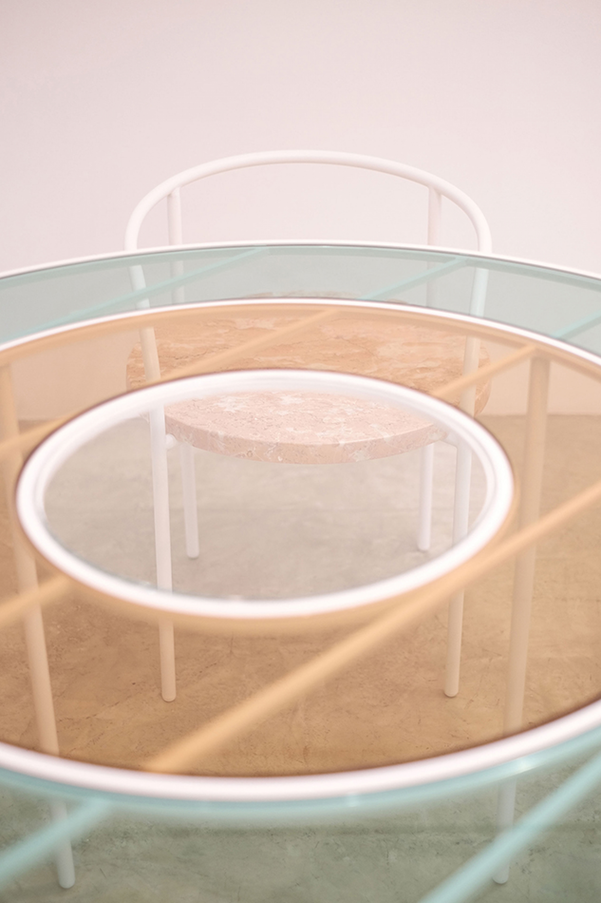 An amalgamation of works that stem from abstract memories of familiar moments, everyday elemental pieces - a table with chairs - that have been crafted out of past memories into new objects, contemporary expressions of notions of form and materiality, articulation and lightness, color and transparency.