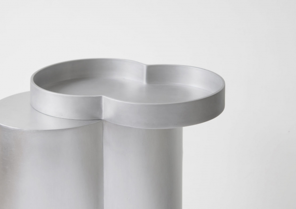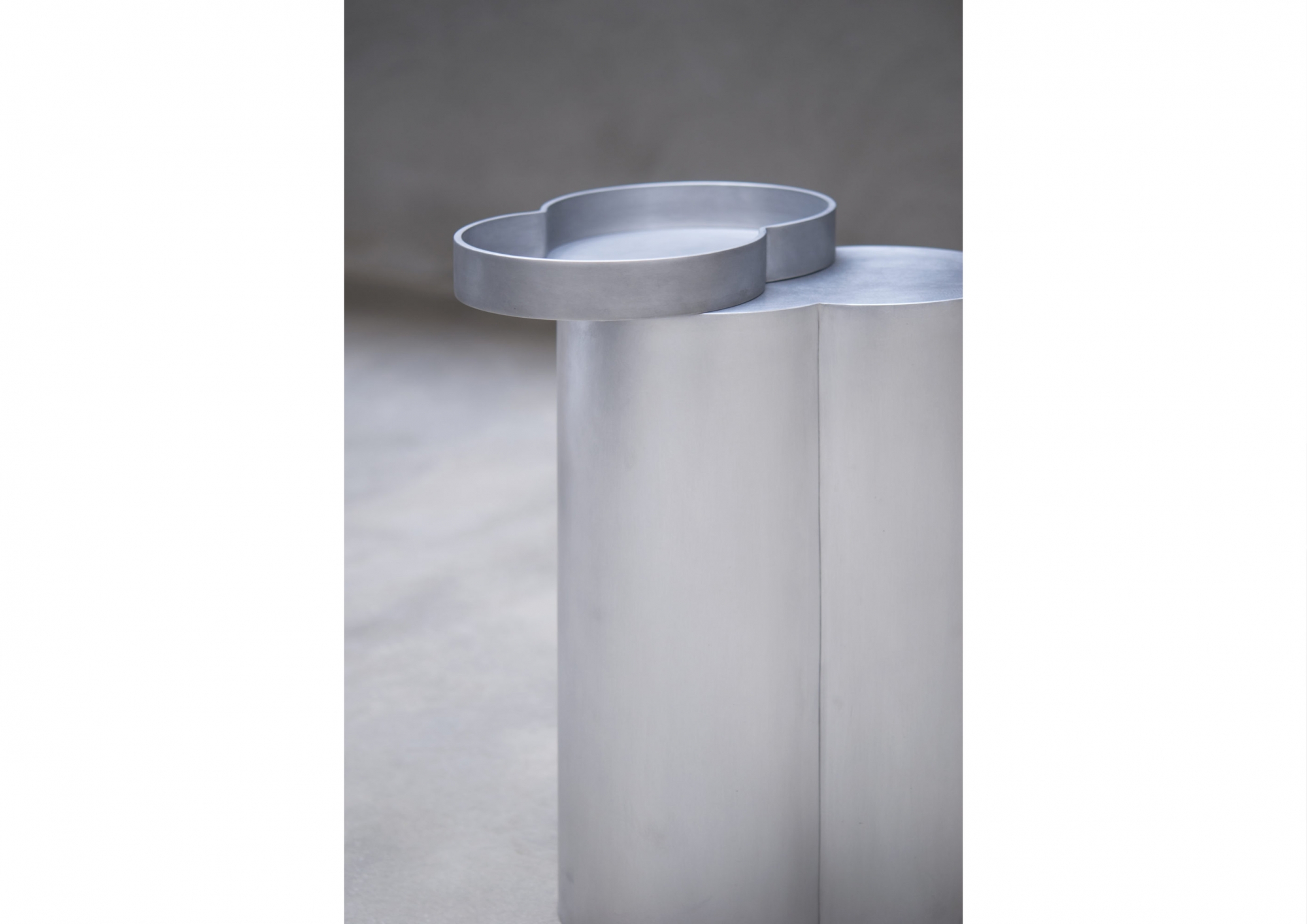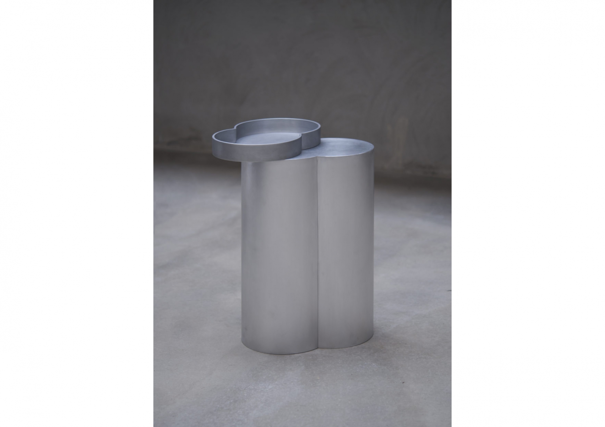The aluminium side table brings a sensual touch into industrial form language. The two tubes fuse to one; it’s like mitosis.