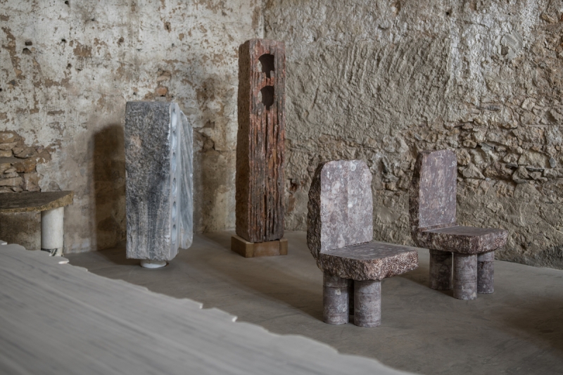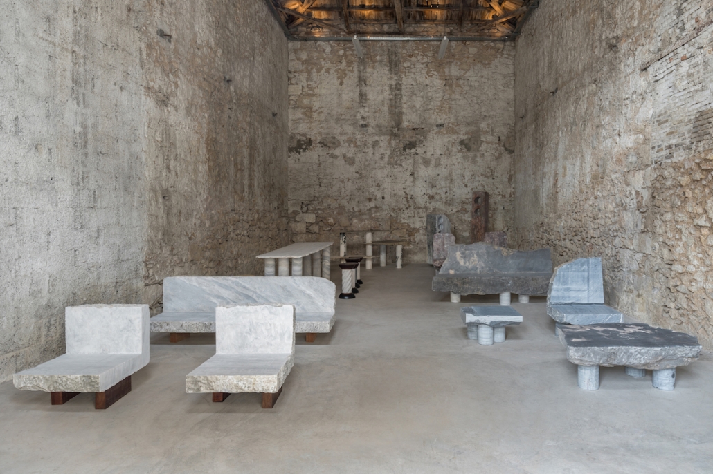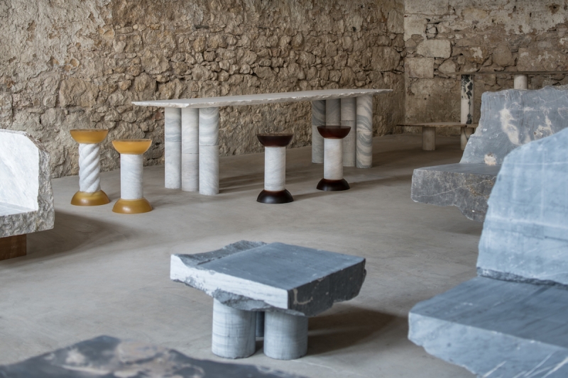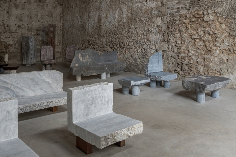 To create the pieces in the collection, Psychoyos uses found pieces of marble that have been abandoned in warehouses and quarries, which were discarded and bear on them the marks of the human hand, machinery, and the elements. These randomly cut and shaped stone fragments the artist selects for their shape and texture, and then reimagines as furniture, giving new life to ancient stones that have lain unused for decades. Because they’re so old, most of these marbles are very rare and impossible to find on the market otherwise.