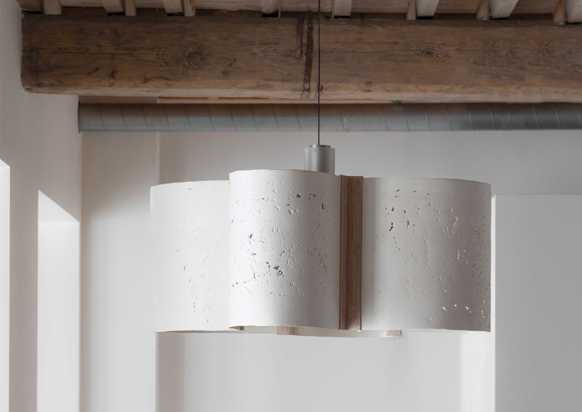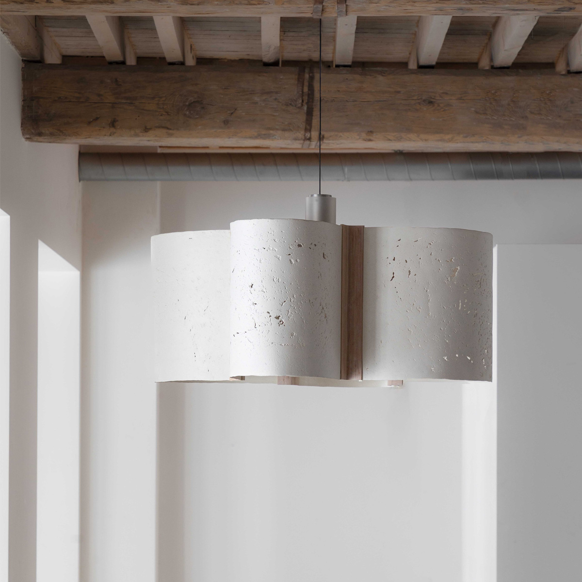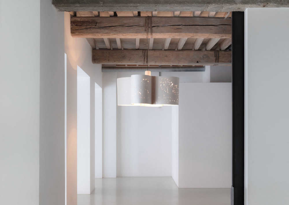 In the CPC Sculpted Light 15082021, four paper shades are held in a delicate frame, resting on a tall structure, both crafted out of Pinus Sylvestris. The thin paper curves are made of a unique mixture of waste paper and stone dust - the Chaud Paper Composite (CPC). A material Charlotte Jonckheer started developing in 2018, exploring its structural, functional and aesthetic qualities in a range of sculptural objects and studies. As much as the CPC approximates the appearance of stone, it offers possibilities that no stone could achieve. For one, the composite is light and flexible and before being pressed and dried, allows to take on any shape imaginable. For the Sculpted Light 15082021 the CPC paper sheets are manufactured in a specific way to obtain its open structure, allowing a playful light effect.