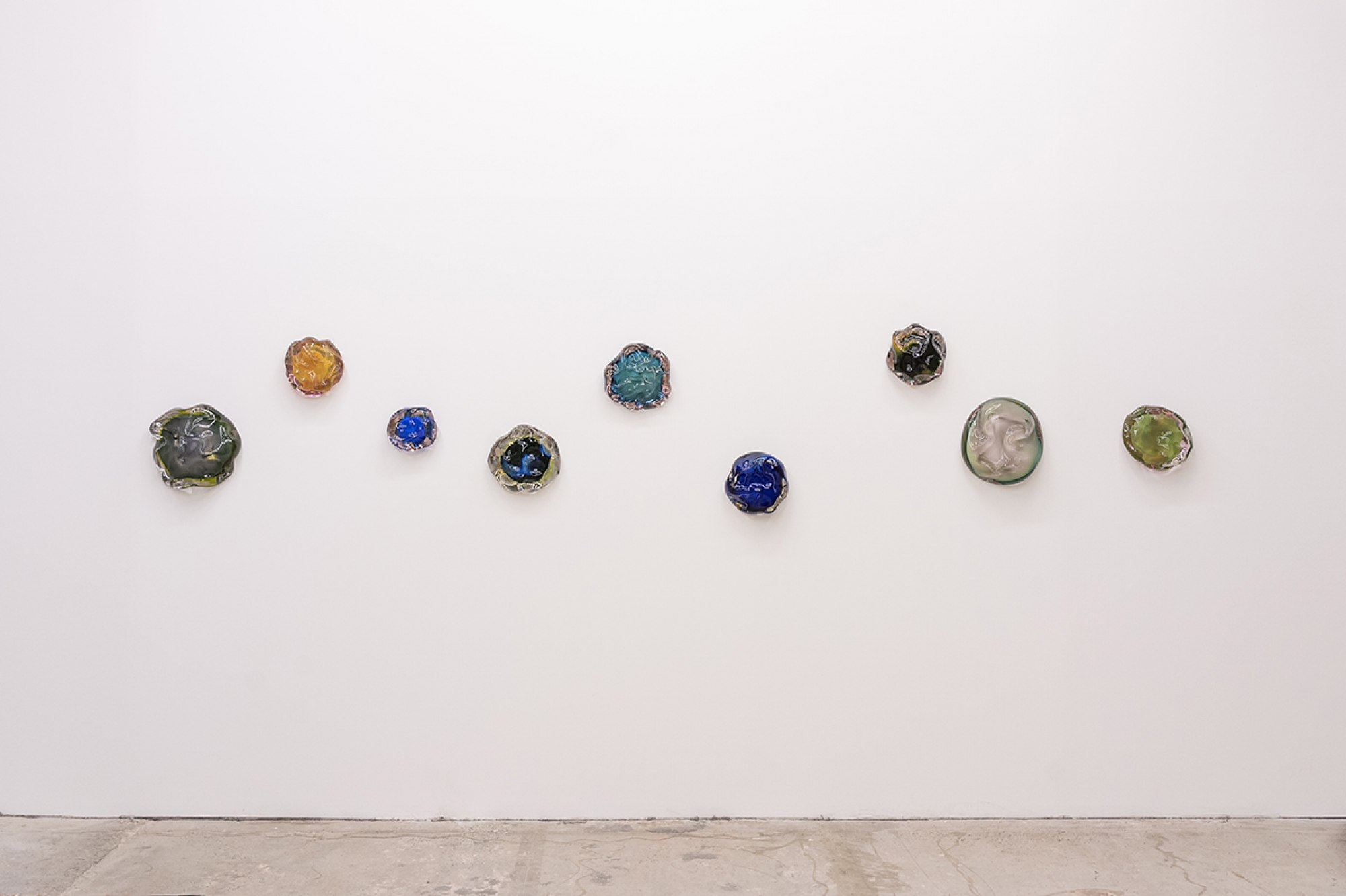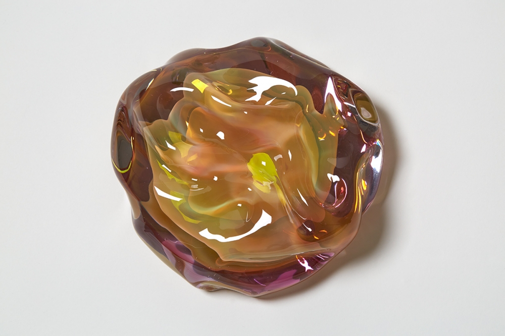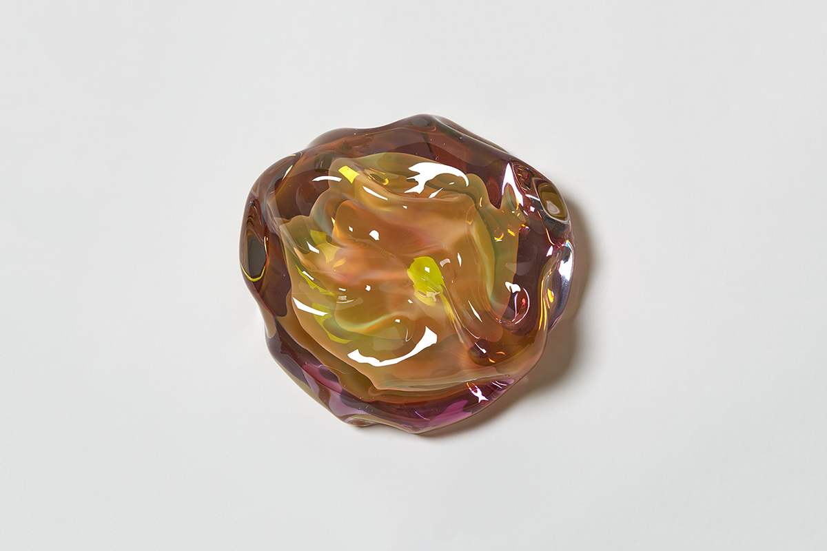 Audi’s practice finds its point of departure within the manipulation of glass. Glass plays a crucial part in contemplating a speculative utopian world where humans create cosmic fragments and new landscape formations. Her Cloudscapes are created using a combination of blown glass, colour pigments and semi-precious materials, such as fine gold and silver. When added to the glass, these elements spark chemical reactions, making the pieces simultaneously scientific and open to chance. The results of Audi’s skilled alchemic glass-blowing process are tactile and sensual, yet contained in a solid glass sculpture. Their undefined edges and fluctuating colours change constantly under different lights.