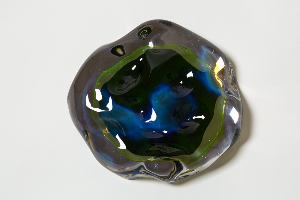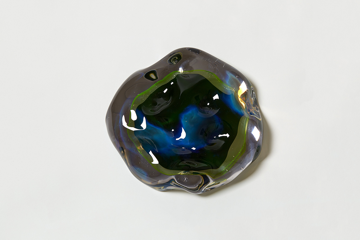Audi’s practice finds its point of departure within the manipulation of glass. Glass plays a crucial part in contemplating a speculative utopian world where humans create cosmic fragments and new landscape formations. Her Cloudscapes are created using a combination of blown glass, colour pigments and semi-precious materials, such as fine gold and silver. When added to the glass, these elements spark chemical reactions, making the pieces simultaneously scientific and open to chance. The results of Audi’s skilled alchemic glass-blowing process are tactile and sensual, yet contained in a solid glass sculpture. Their undefined edges and fluctuating colours change constantly under different lights.