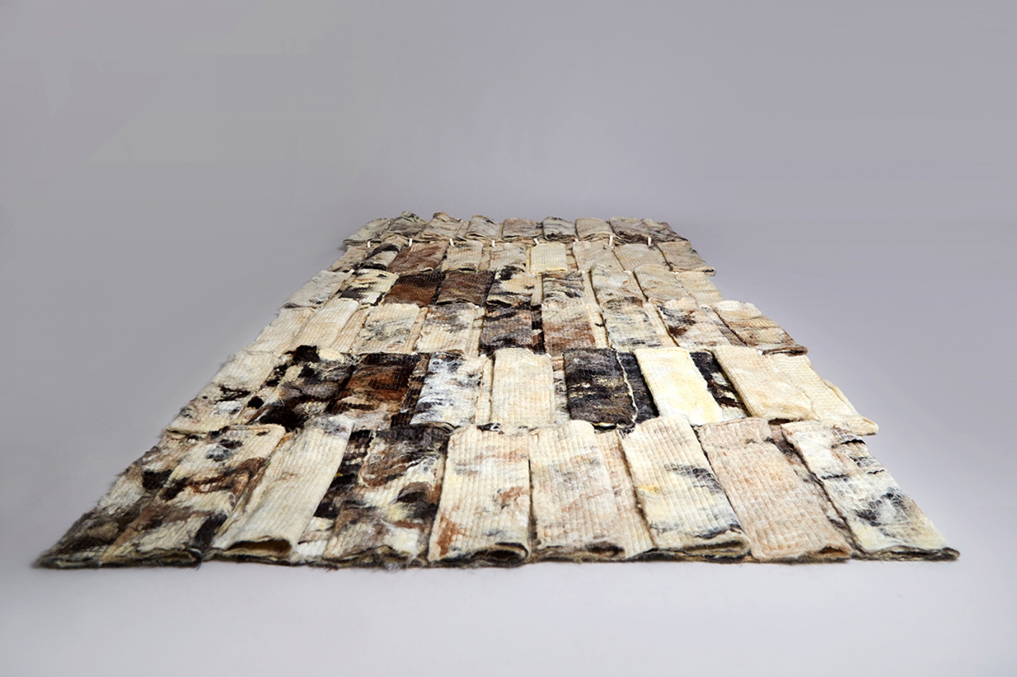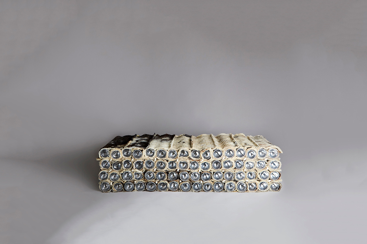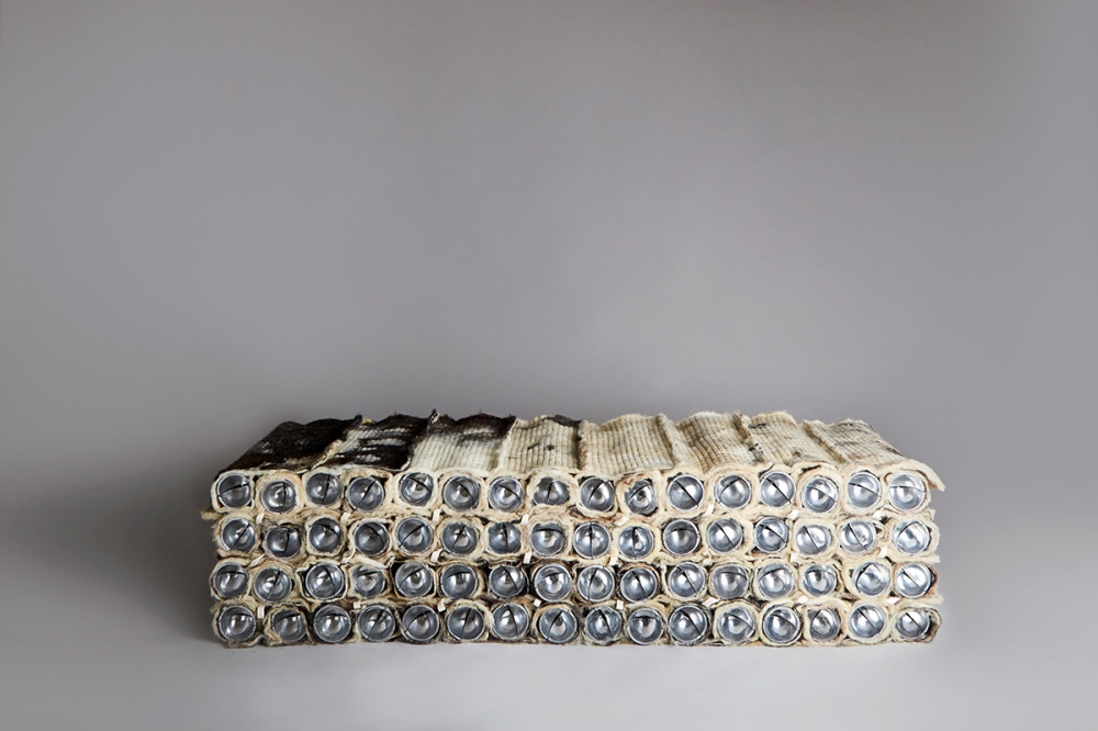 Ghaith Abi Ghanem & Jad Melki trained at Raëd Abillama Architects (Lebanon) and at Herzog and de Meuron (Switzerland), before setting up their collective. Their practice allows experimentation to freely sculpt their designs and focuses on being true to material and responsive to context. Developed for Wehe, from a slender metallic capsule emerges rug, recliner, bench and banner: an object with multiple lives and myriad forms. Myriad was inspired by the resilience and ritual of traditional life, the raw texture of undyed wool can be spread out as carpet, or suspended from the wall. When wrapped around its canister, the fabric gains volume and weight and takes on a contemporary form, becoming a seat or headrest, responding to the body at ease. Felted, quilted, cut, cast and polished, the piece’s materiality reflects centuries of local craftsmanship. Ghaith&Jad’s object marries the mysterious with the utilitarian, inviting an encounter both visual and tactile. A union of historic craftsmanship and contemporary design, this object defies single definition: at once architectural and ambiguous, hard and supple, protective and inviting, a body of both bone and fat.