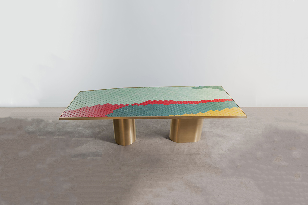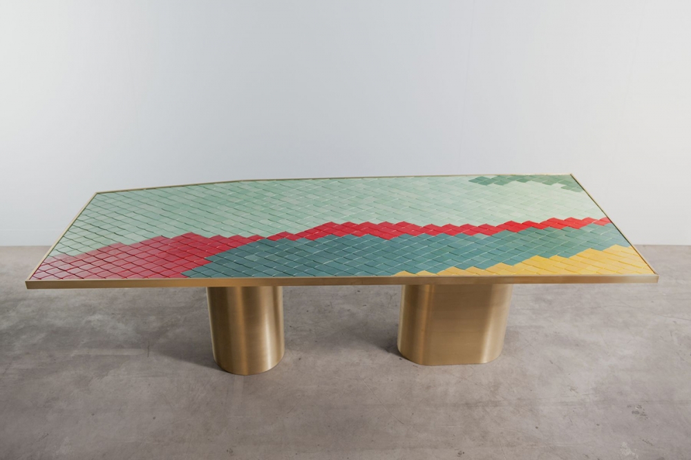 Landscapes project is an abstract color composition inspired by Iznik tiles, conceived of as a reinterpretation of the 16th century Ottoman tradition. The series’ aesthetic derived from a research into the Ottoman style of fabricating quartz tiles, as well as a new approach for the construction of monumental tables, therefore creating objects that surprise the senses with reflections and heady colors. The collaboration with the ateliers of the Iznik Foundation, based in Bursa-Turkey, famous for their creations for the most important mosques in the Middle East and Hermès stores, offered the perfect savoir-faire for this project. An exclusive range of custom-made colors has been developed to produce the unique reflective shine of the product.