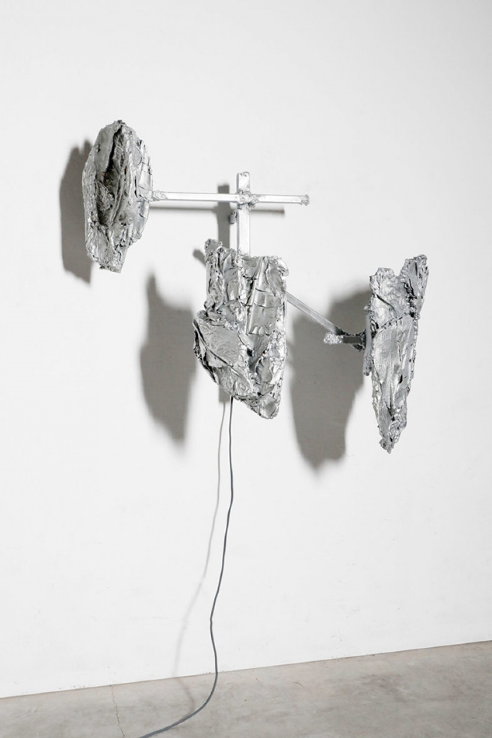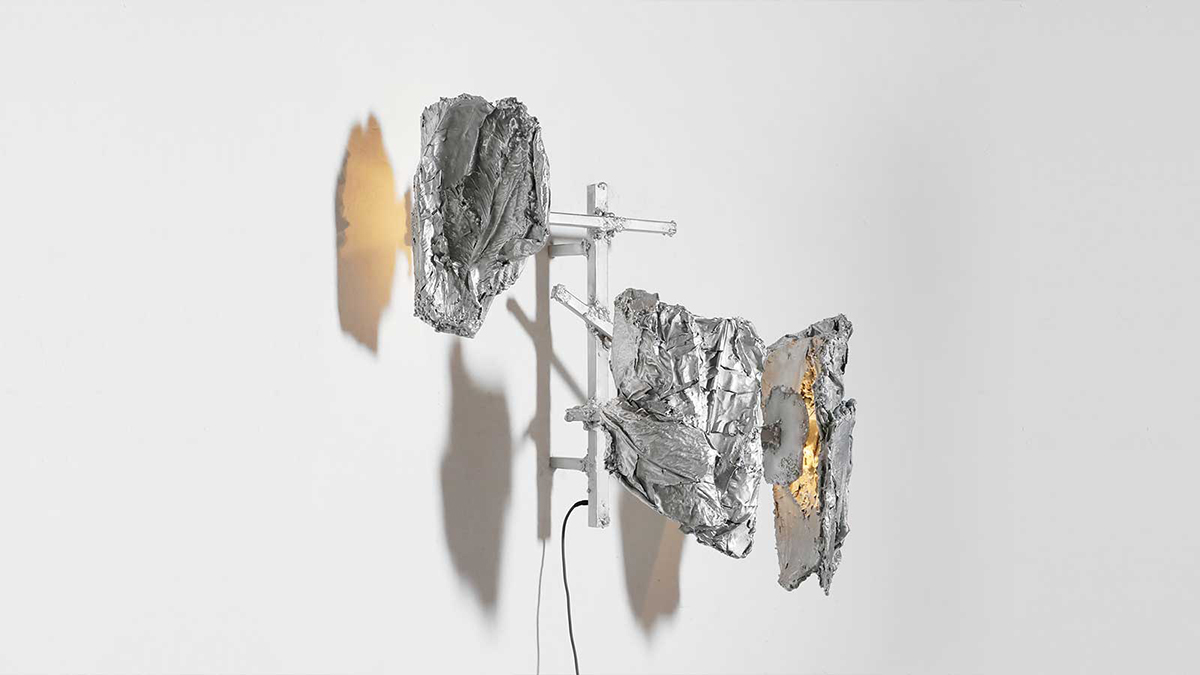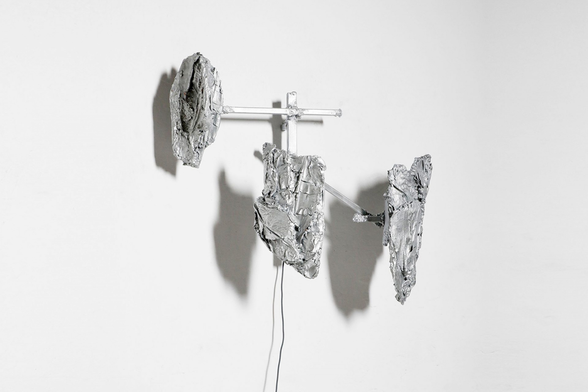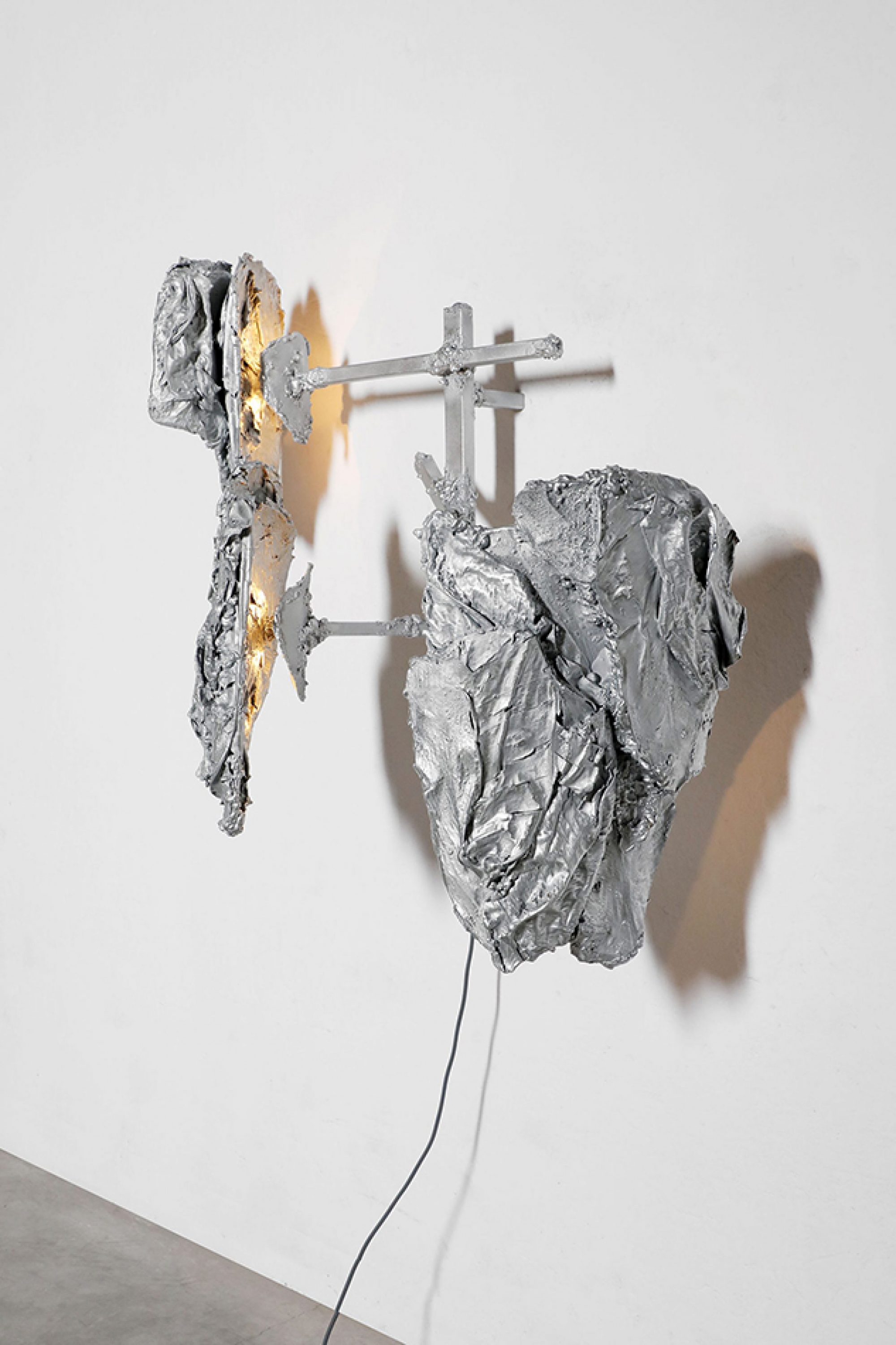 There must be a hidden skeleton within. A bodily scaffolding reminiscent of nothing but an abstract, metal ribcage – an entity yet to be born. The convulsive shapes of the wire veins which become intertwined with one another creating both surprising and familiar presence. Led by a chance of a human gesture they meander through an empty space until the anatomy is carved around it. Stunned and unable to name its bizarre familiarity, one is forced to wait and observe as the metal structure becomes wrapped with a sparse weight of the natural tissue. It is only now, when the metallic fossil has emerged from the slow process of creation, one can understand its enigmatic familiarity. A frozen and reshaped memorabilia referencing17th century furniture emerges before you – constantly becoming and carrying on the memory of time, space, material and the creative act.