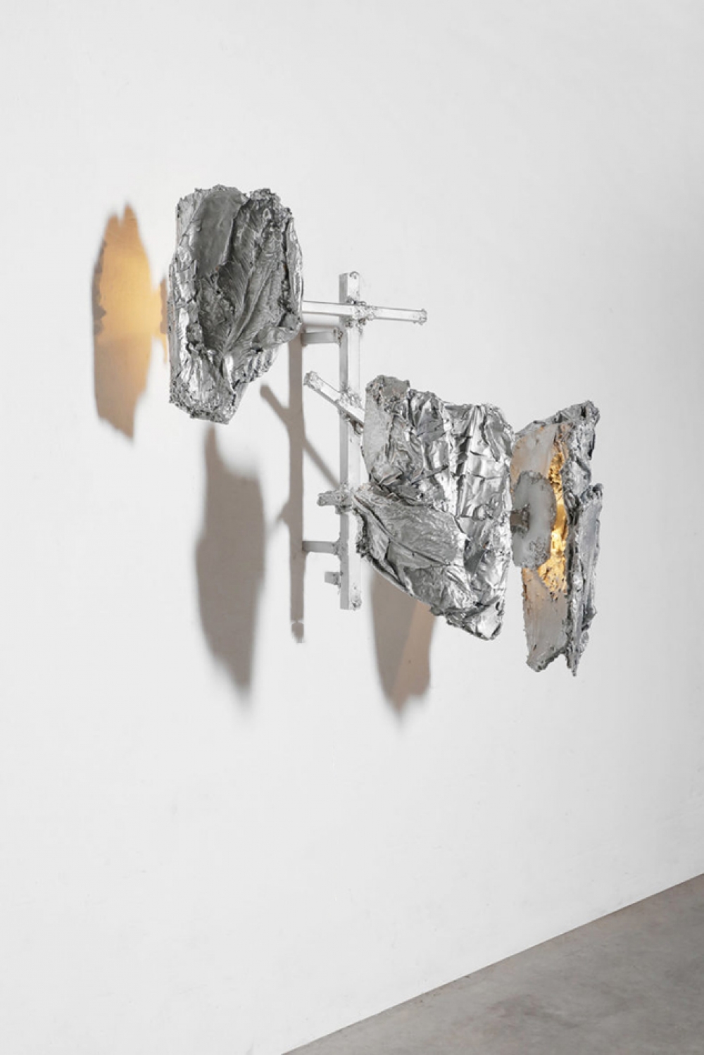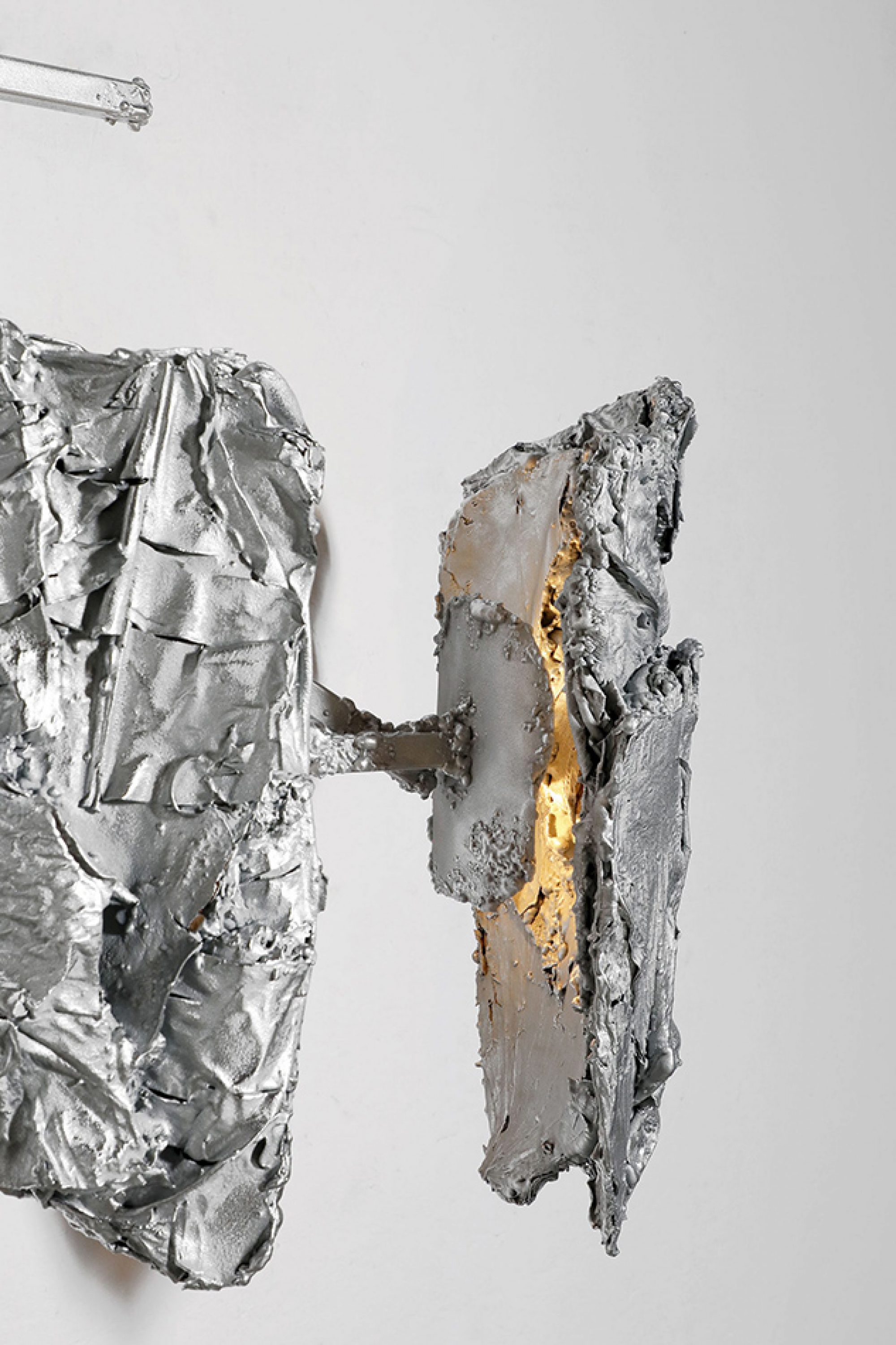 Unique light sculpture made with natural leaves, zinc, steel and resin