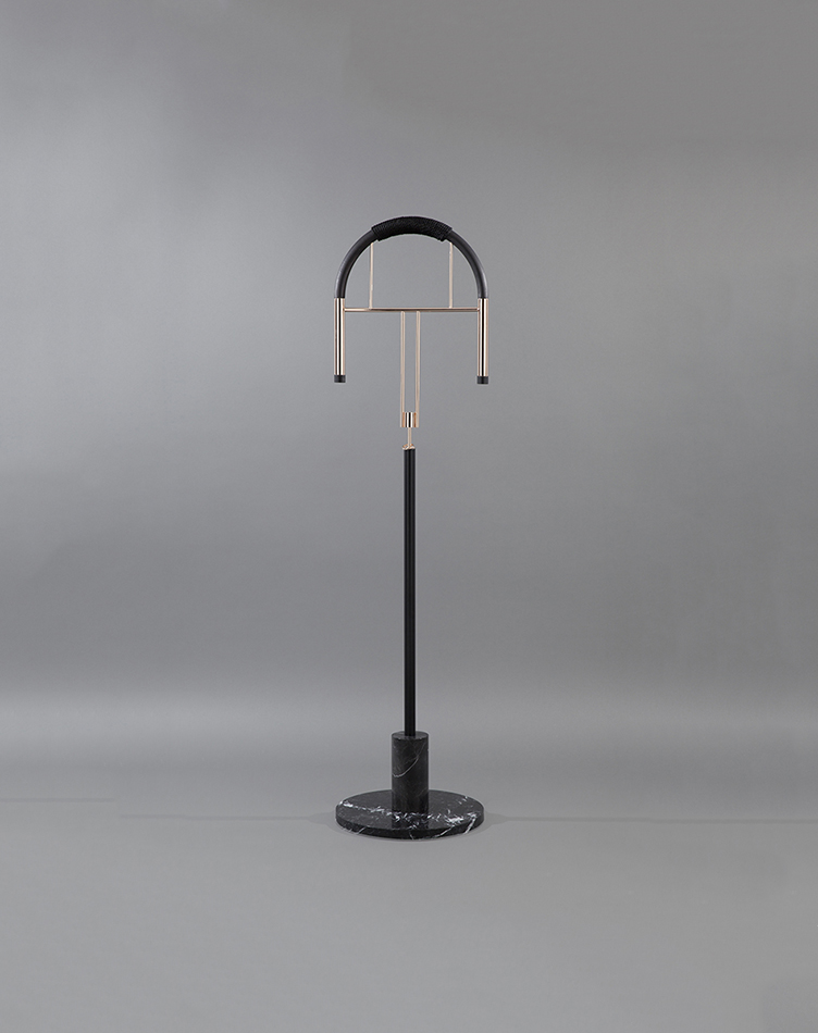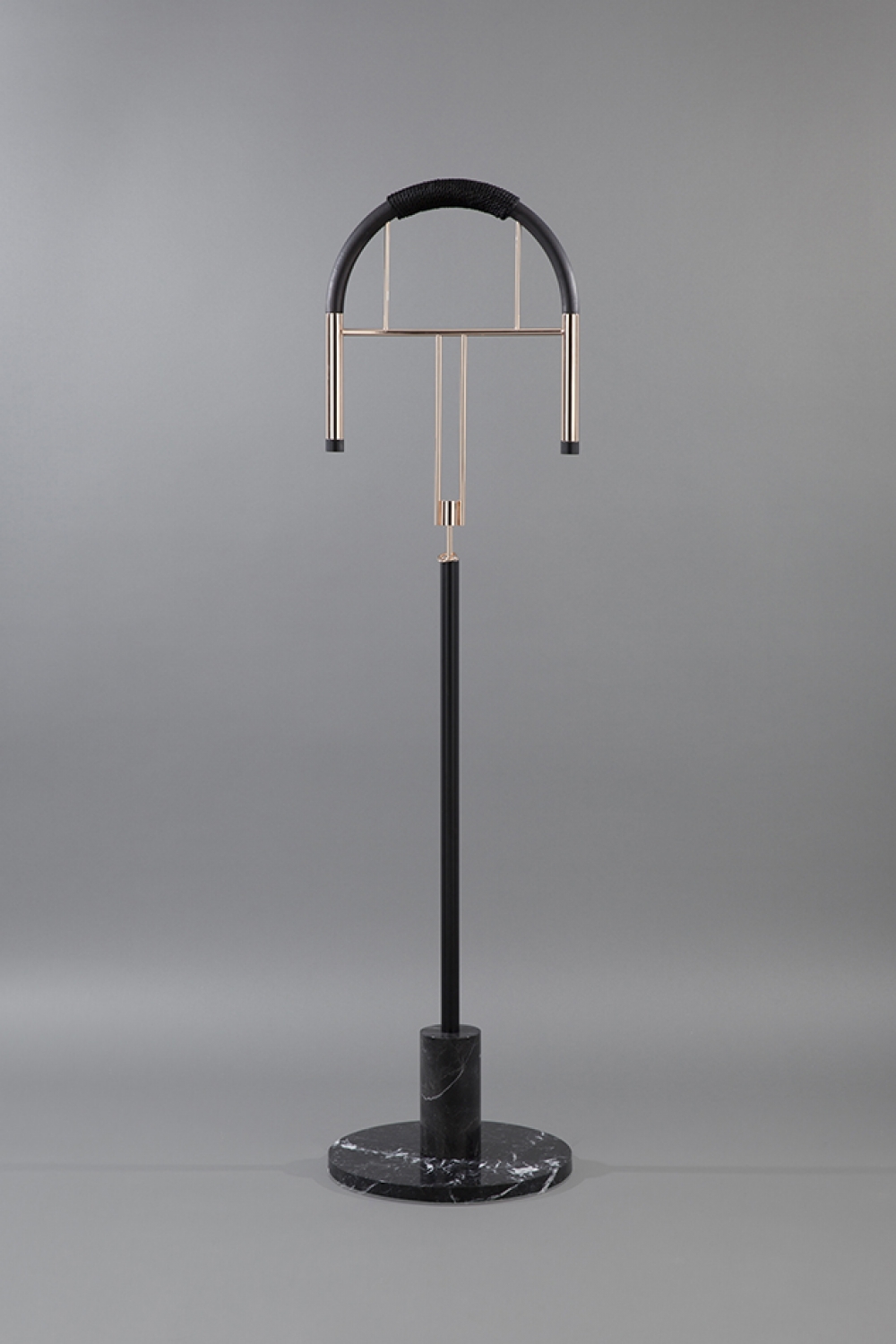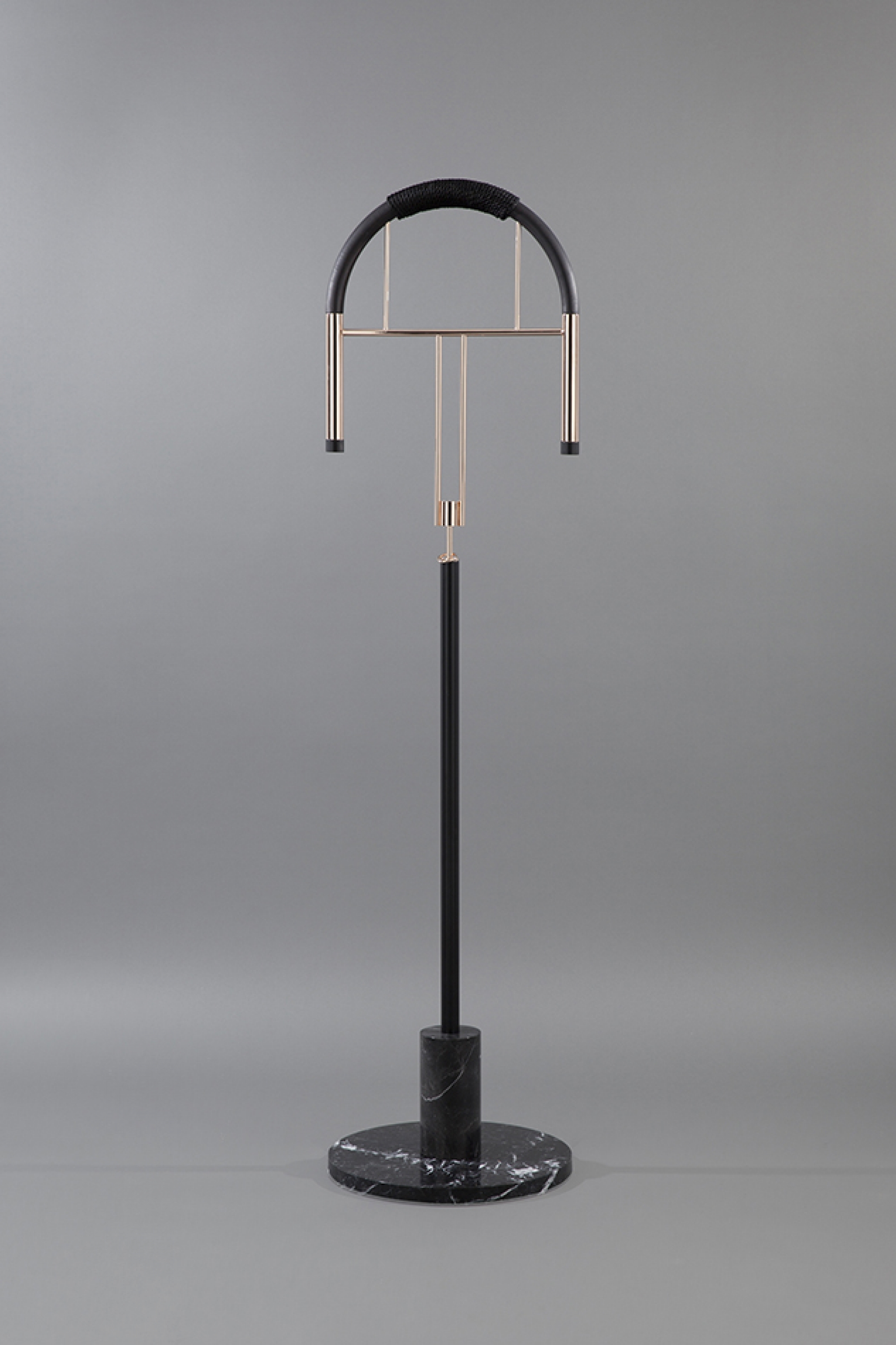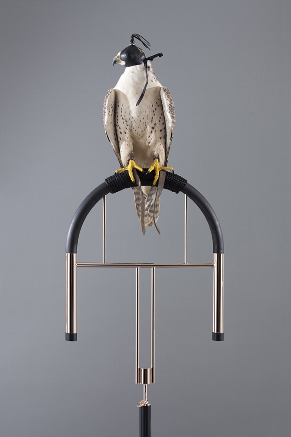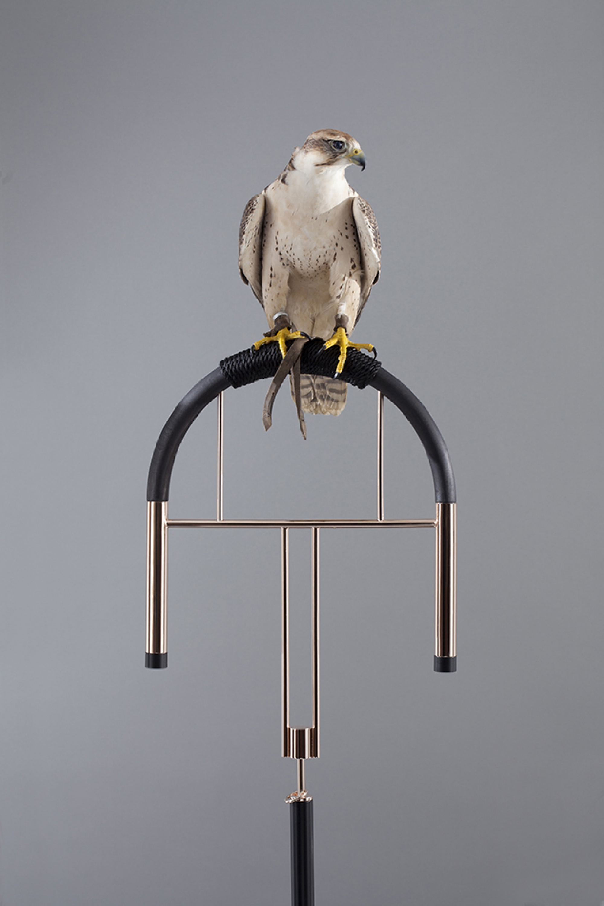 Posa Project is an installation of four collectible falcon perches. Posa combines volumes and geometric forms adapted to precise technical requirements. This new interpretation of falcon perches comes directly from the original aesthetical criterions and combined with luxurious materials they become a precious object. The solid beech wooden ring is handmade from a factory in Italy that developed the components of the famous Thonet chair. All the metallic elements are rigorously and meticulously plated with pure gold, pink gold, shiny and mat silver in De Vecchi laboratories. The result is a sculptural and elegant object that flows with the ergonomic demands of the raptors. Two different types of support are proposed as an option according to the origin of the falcon (arboreal or desert environments). The wide support area and the stability of the marble base offer a secure stationing to the animal, while the inside structure of the circle has a structural function and doesn’t allow the bird to cross the lower part. The collectible falcon perch is a cultural hybrid, a decorative object with pure lines and noble materials, a reminiscence of medieval practices meeting contemporary Middle Eastern practices with the know-how of Italian craftsmanship.