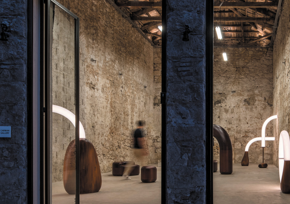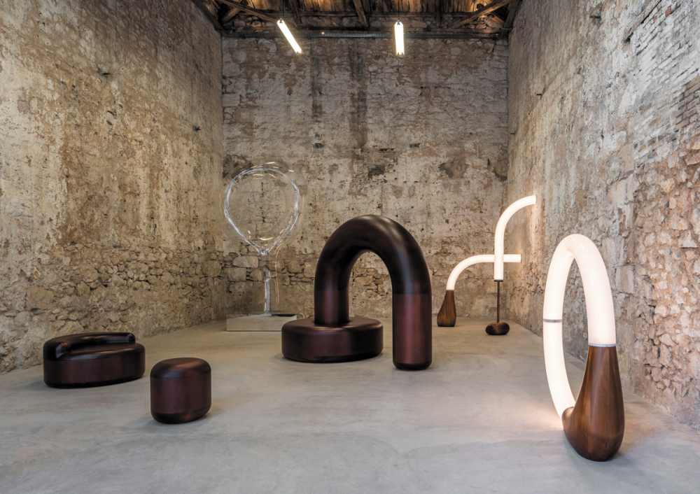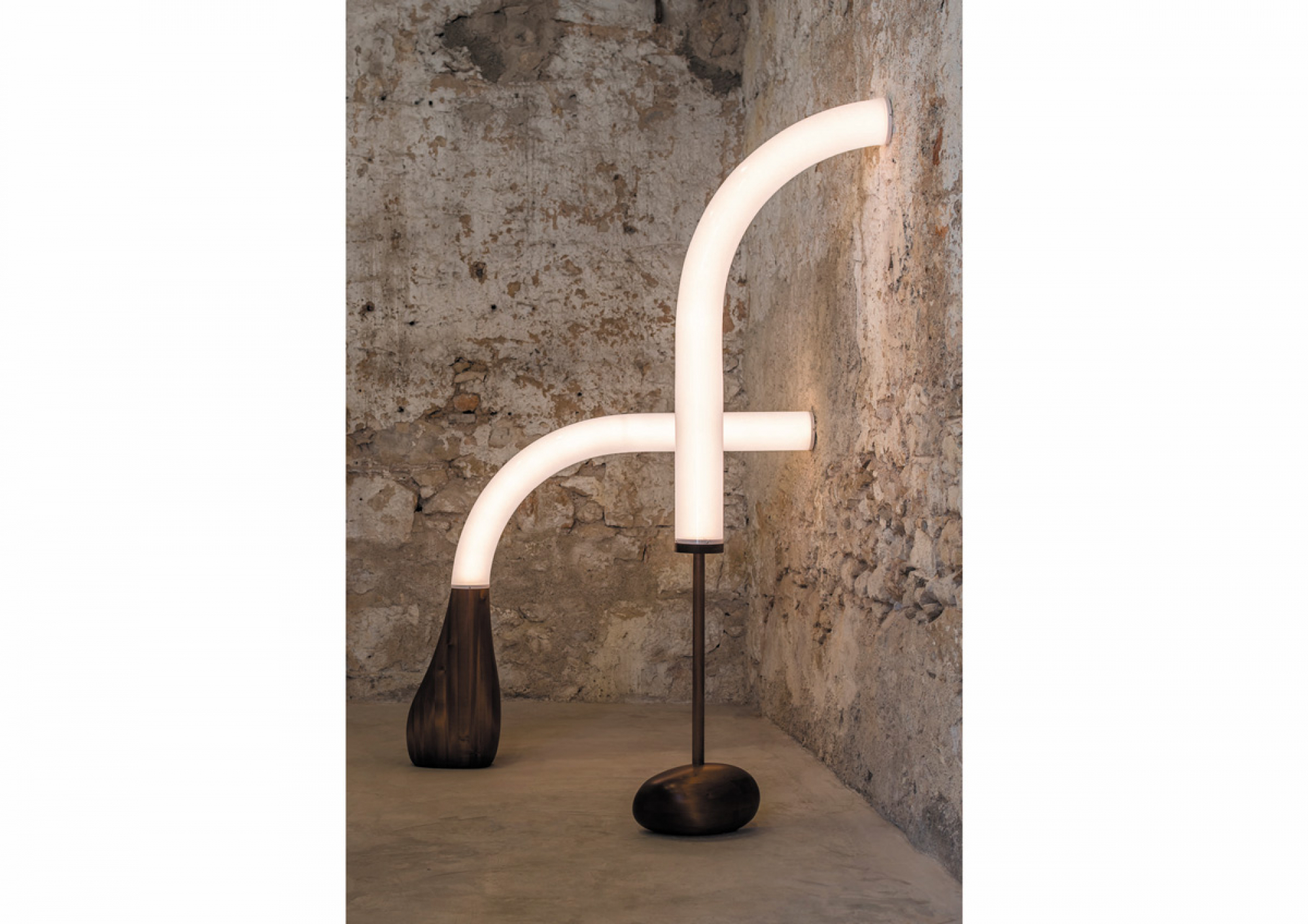 Tube Lights is a series of lights – floor, wall and ceiling mount – abstract sculptural articulations, lit from within, that appear to be pliant or soft yet powerful, as they emerge from and recede into the floor and walls.
