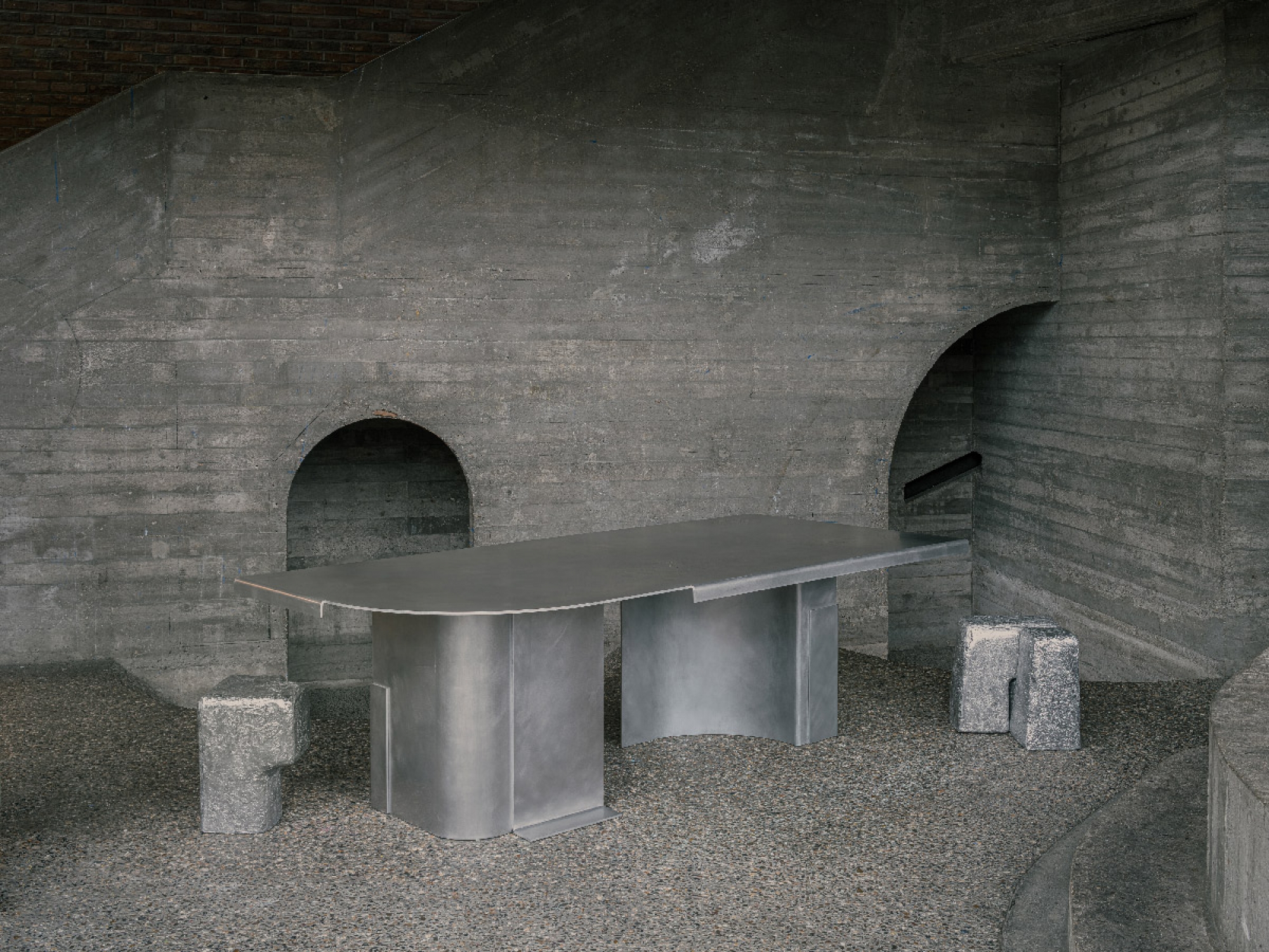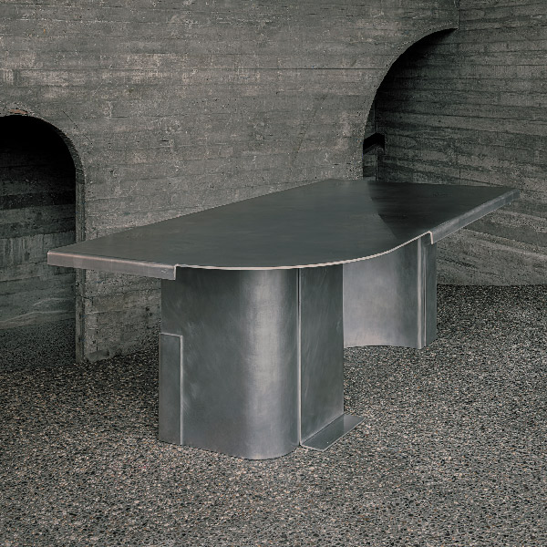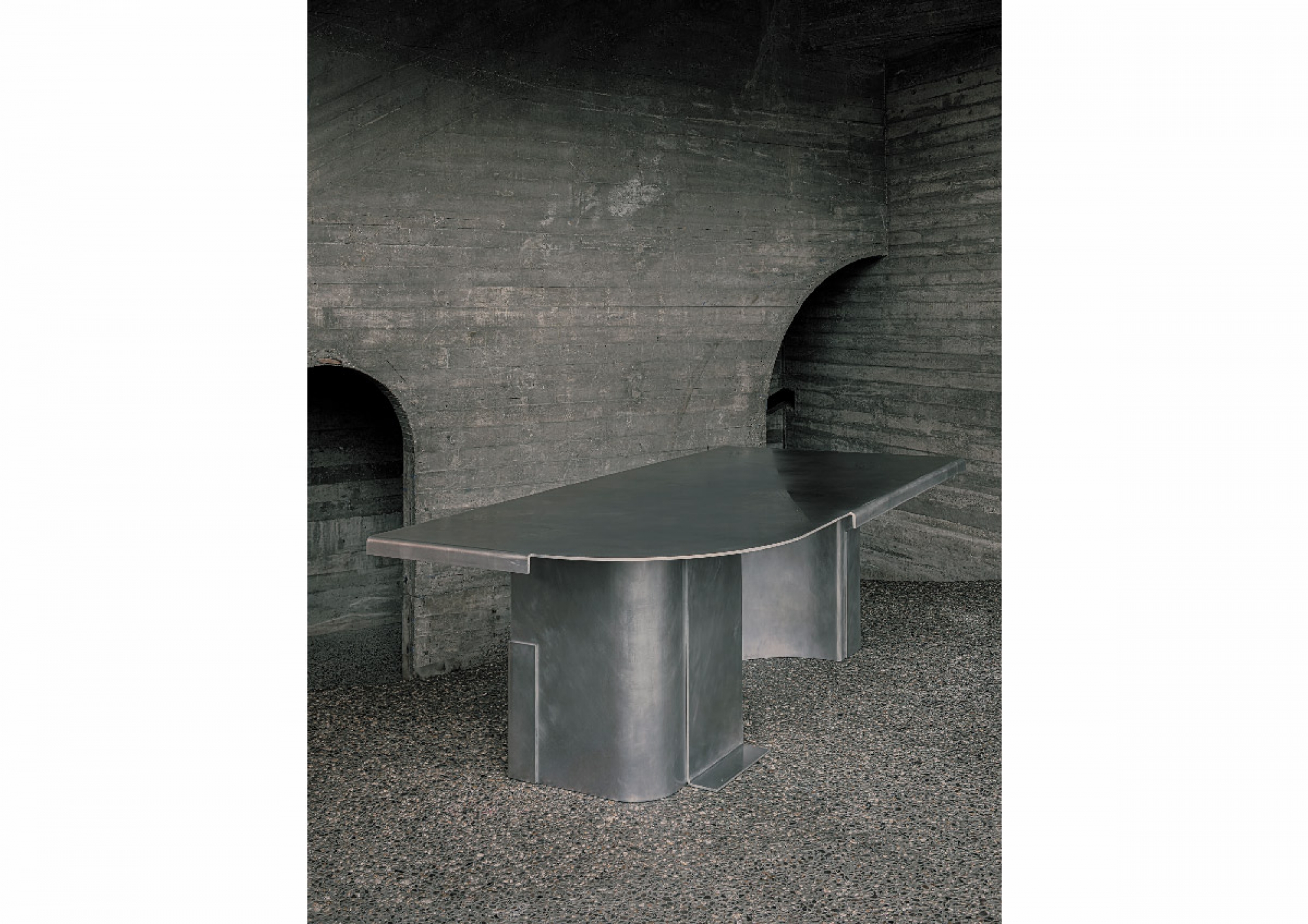 The Dining Table is a three-dimensional object generated by bending flat sheets of aluminium with shaped borders, where the material reveals itself in seamless sequences, alternating between a back and a front, a form and a corresponding counter-form. Without becoming specifically recognizable, its profile reveal continual references to geometries with both classical and modern overtones.
